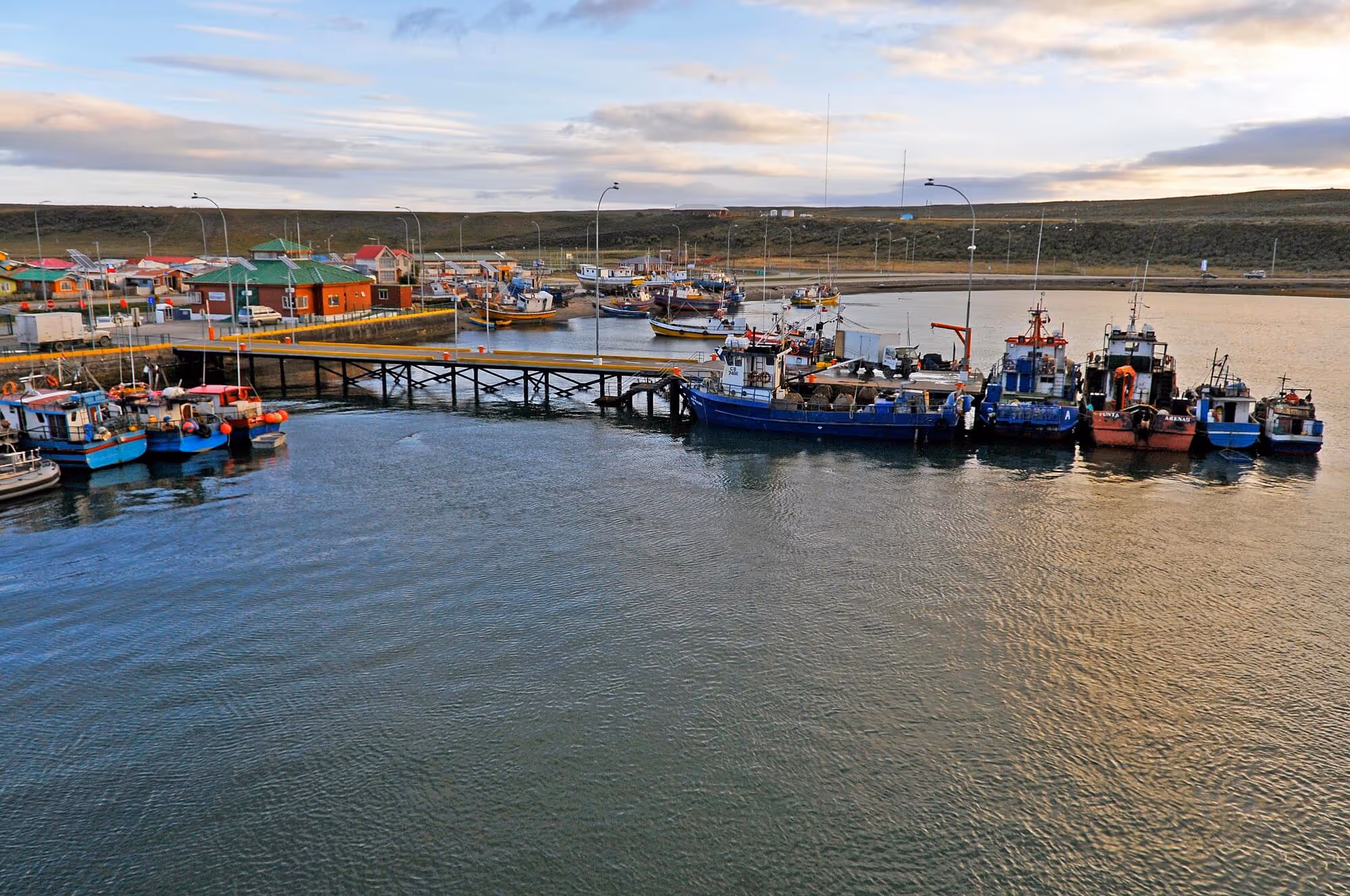 The harbor of Porvenir, Chile, featuring a cluster of colorful fishing boats docked along a small pier.
