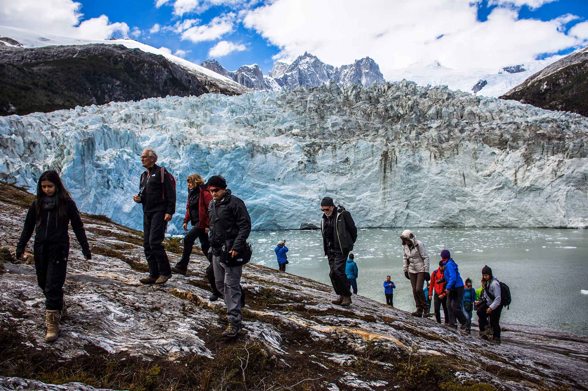 A group of people exploring the rocky terrain in front of the Pia Glacier in Patagonia.