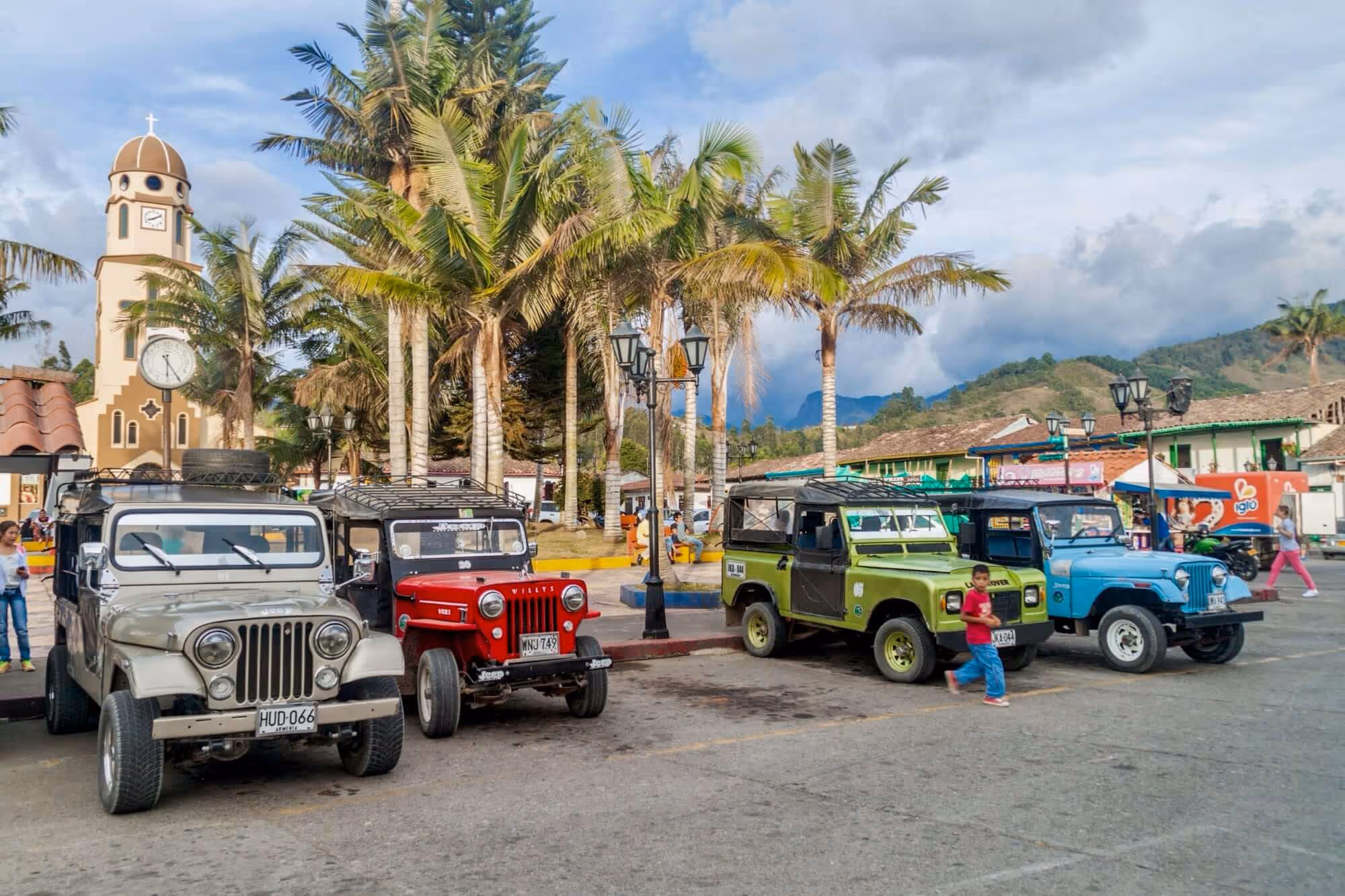 The vibrant main plaza of Salento, a charming town in Colombia’s Coffee Triangle. The plaza is lined with iconic Willy’s Jeeps, a popular mode of transportation in the region, often used for rugged terrain and local tours.