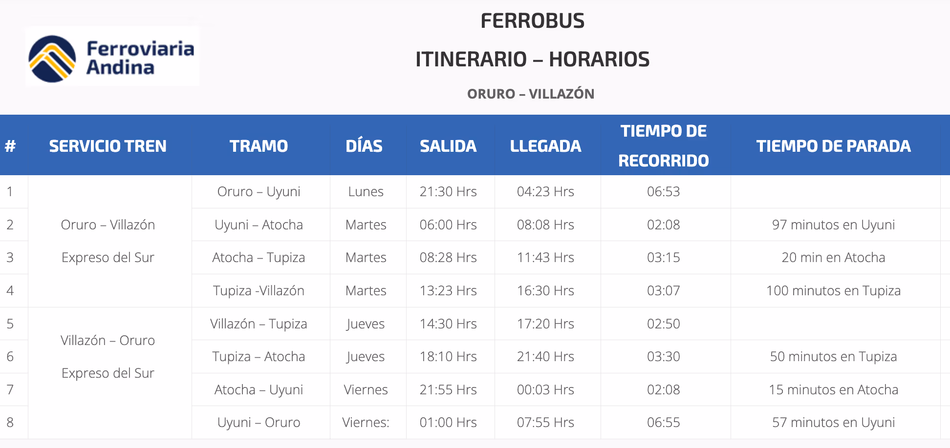 Timetable Train Villazon-Uyuni-Oruro 2024