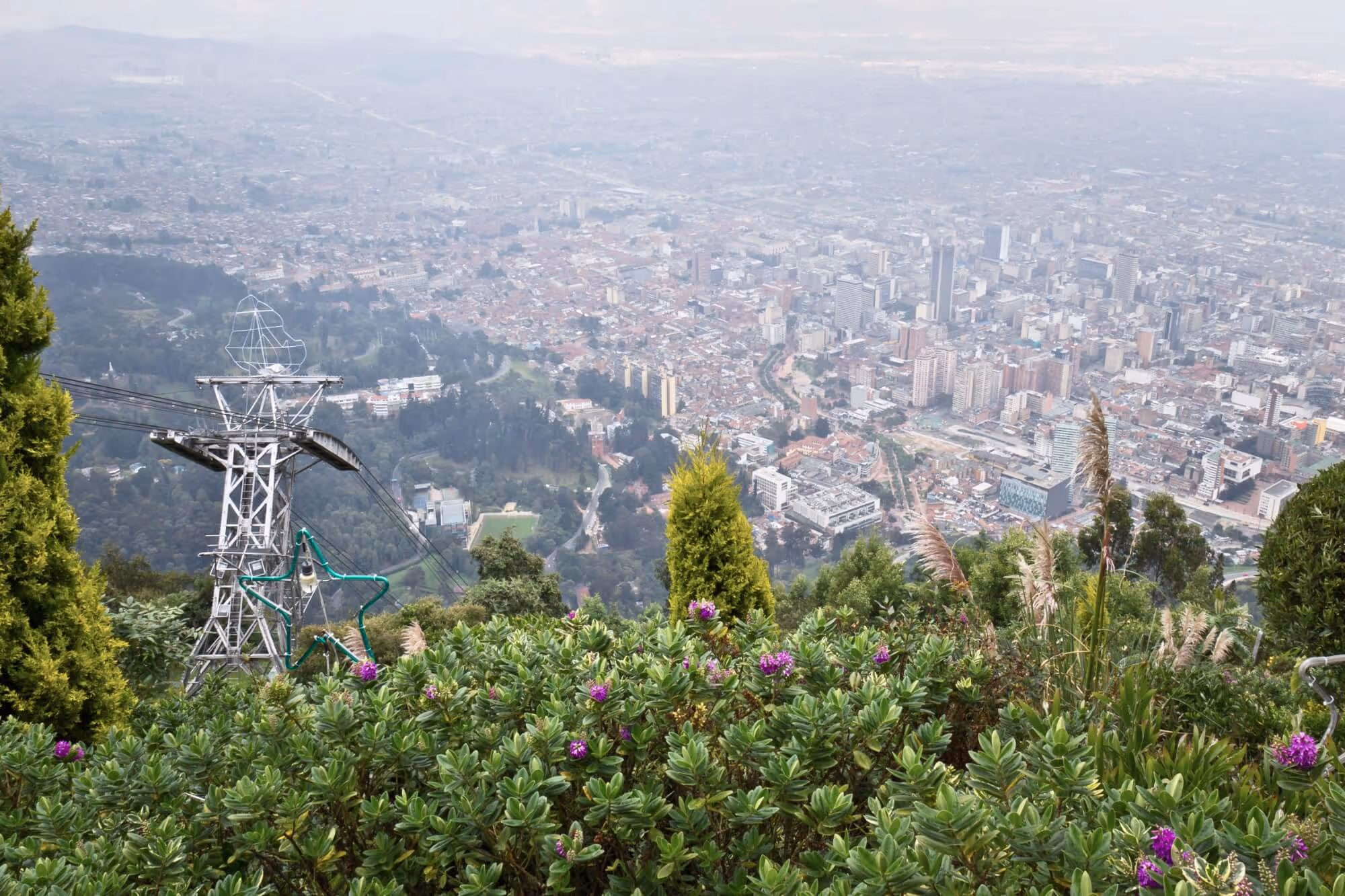 Passengers enjoy panoramic views of Bogotá and its surroundings through the cable car's large windows during the seven-minute ride.