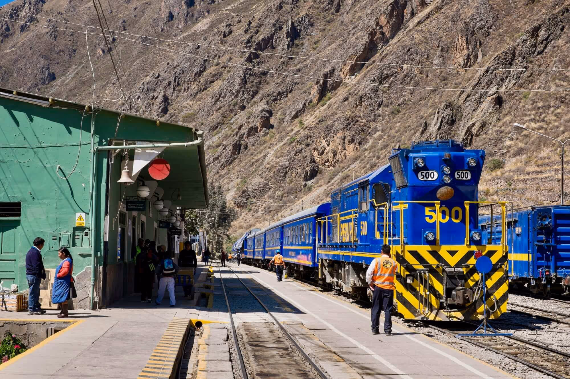 A blue Vistadome train awaits passengers at Ollantaytambo station, ready to embark on a journey through the scenic Sacred Valley towards Machu Picchu.