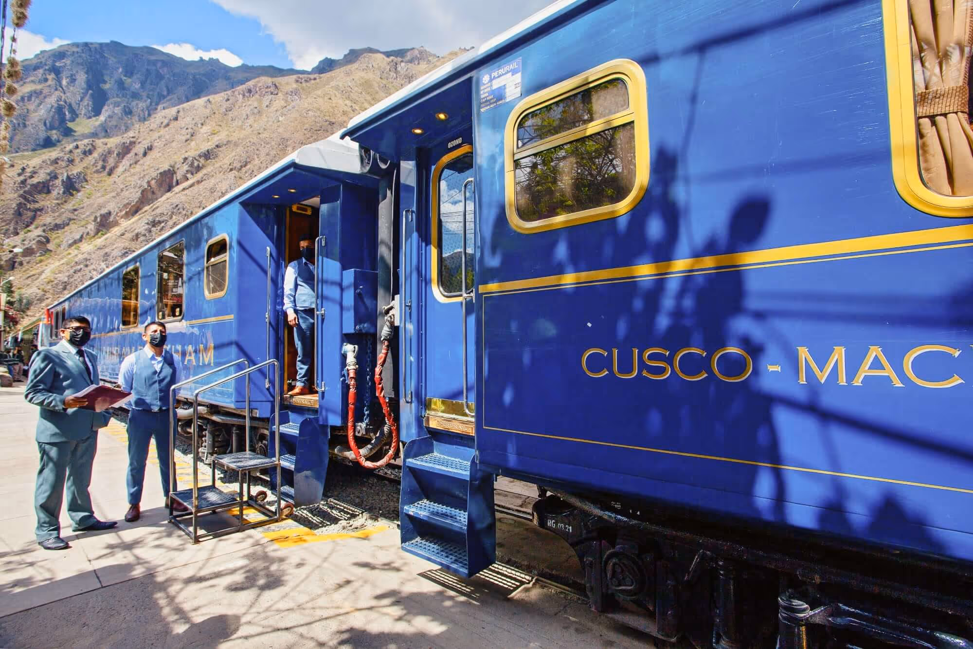 The luxurious Hiram Bingham train, painted in deep blue with gleaming brass accents, awaits passengers at Poroy station near Cusco. The platform bustles with activity as travelers prepare to embark on their journey to the enchanting Machu Picchu.