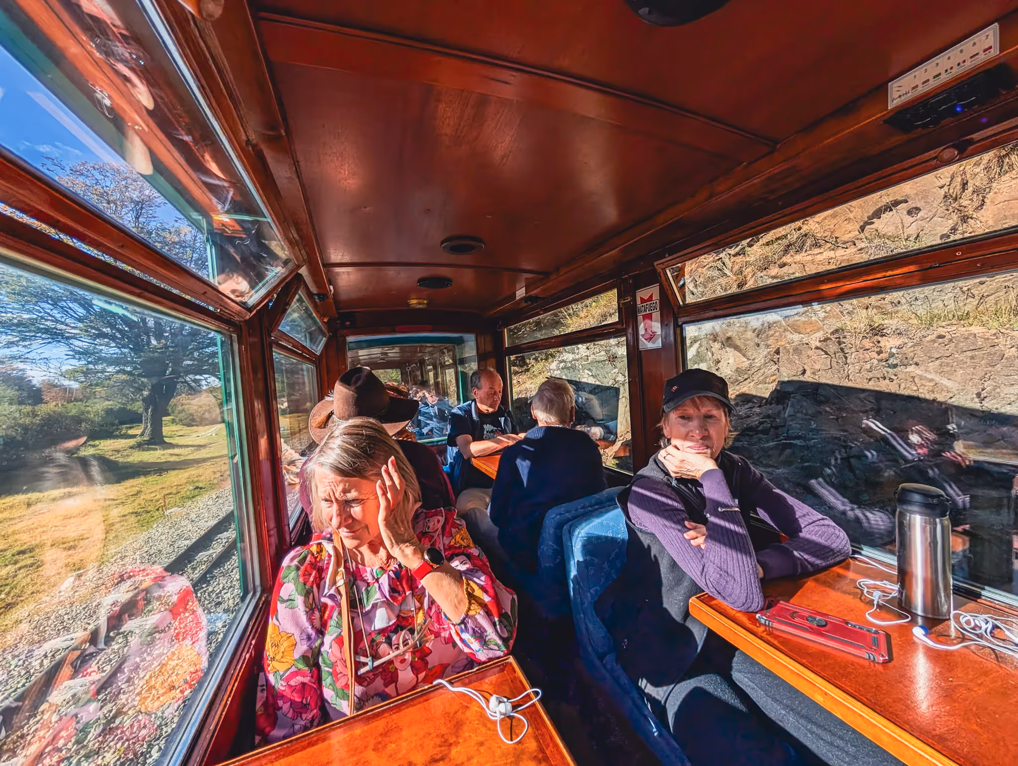A cosy moment aboard the Tren del Fin del Mundo — my tour group relaxing in the warm, wood-lined carriage, sunlight streaming through the windows as the Patagonian landscape drifts quietly past at the end of the world.